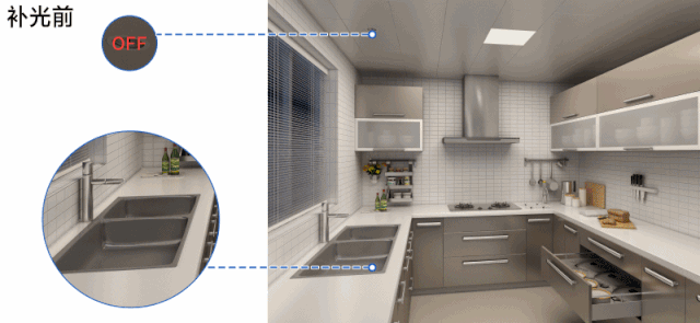 为了空间利用最大化,厨房大都配置了很多存储柜,有些柜子比较深,拿取东西时很不方便,而在柜内补光,拿取物品就方便多了。