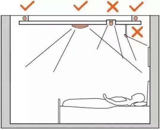 基于老人生活的便利性,房间内的灯具开关最好设置成双切式,在卧室门口和床边各设置一个开关。卧室门口处的开关离地高度应兼顾站立老人和轮椅老人的需求;另一组设置在床头边的开关,其高度和离床距离都要特别设计,保证在床上伸手就能触碰到开关。